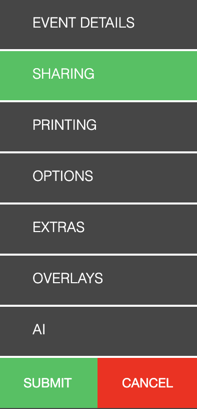 The Sharing section lists all of the sharing options a guest can use to share their media. Facebook, Twitter, Instagram, Email, and Text Messages are available for your guests. Smugmug is a third party online gallery service that you can use to upload all your media to. Unique URL is a customizable microsite that can host a guests media when they share. (example: http://laphotoparty.com/events/1615/64wjrf/) Unique URL is available as an option for all sharing platforms except Instagram and Smugmug.