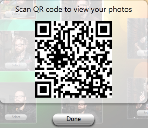 - This option will populate a QR code when the photo is selected that guests can scan. Note: This is not part of RFID services, only regular sharing. With QR enabled, rather than having other digital delivery options (such as SMS or email), the See example below: