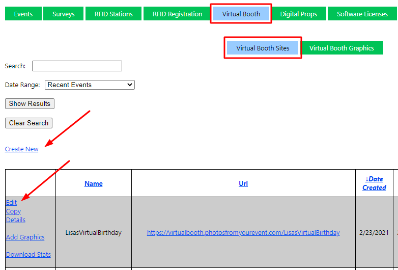 Start by editing your Virtual Booth site by clicking the Edit link to the left of your Virtual Booth Site name, or create a new site by clicking Create New at the top of the Virtual Booth Sites list.
