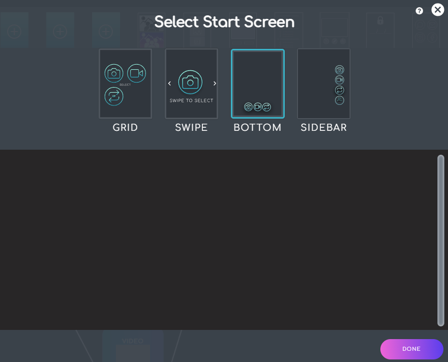 In Settings for your Start Screen node, you'll find the list of our default layout options to select from. Use the arrows or click and drag the carousel left or right to see the options. Click to select the option you want and click Done to save and exit.