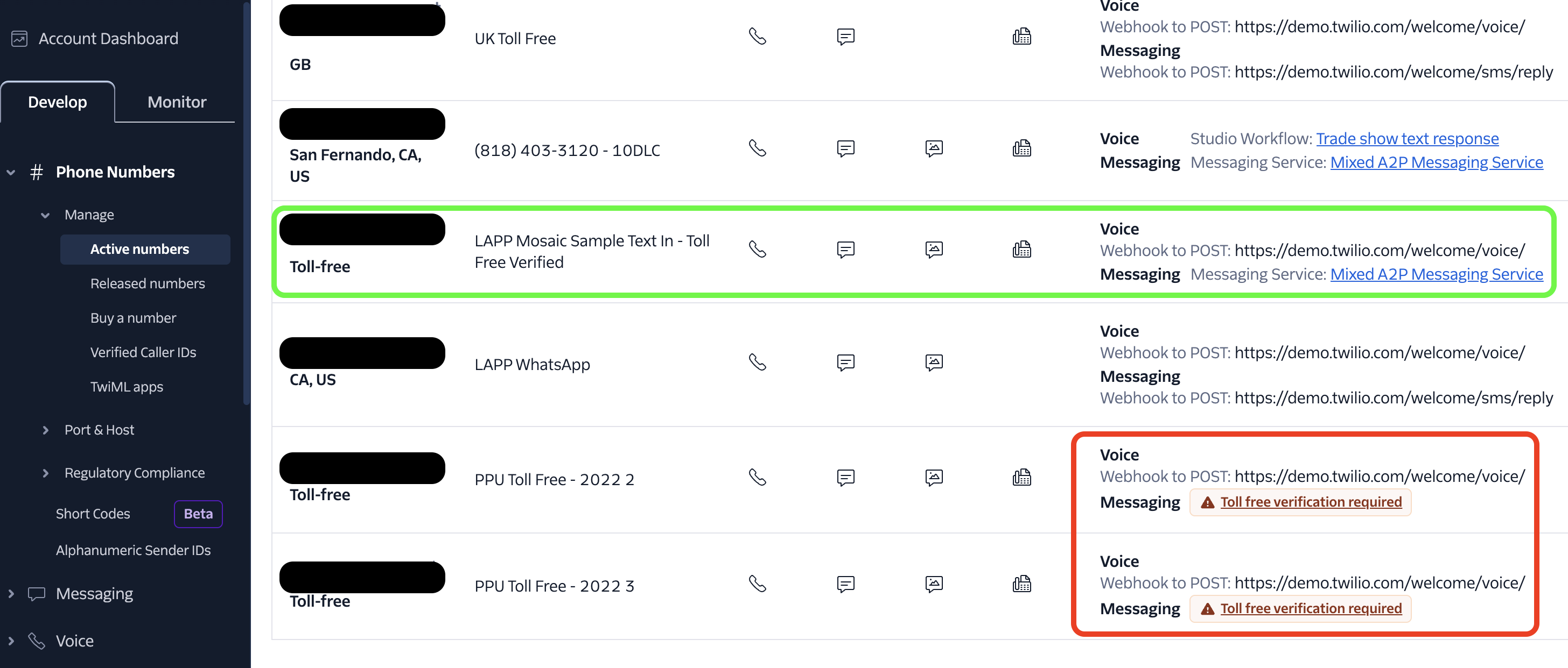 The image below shows some examples of how verified vs non-verified numbers will appear in your Twilio Dashboard: