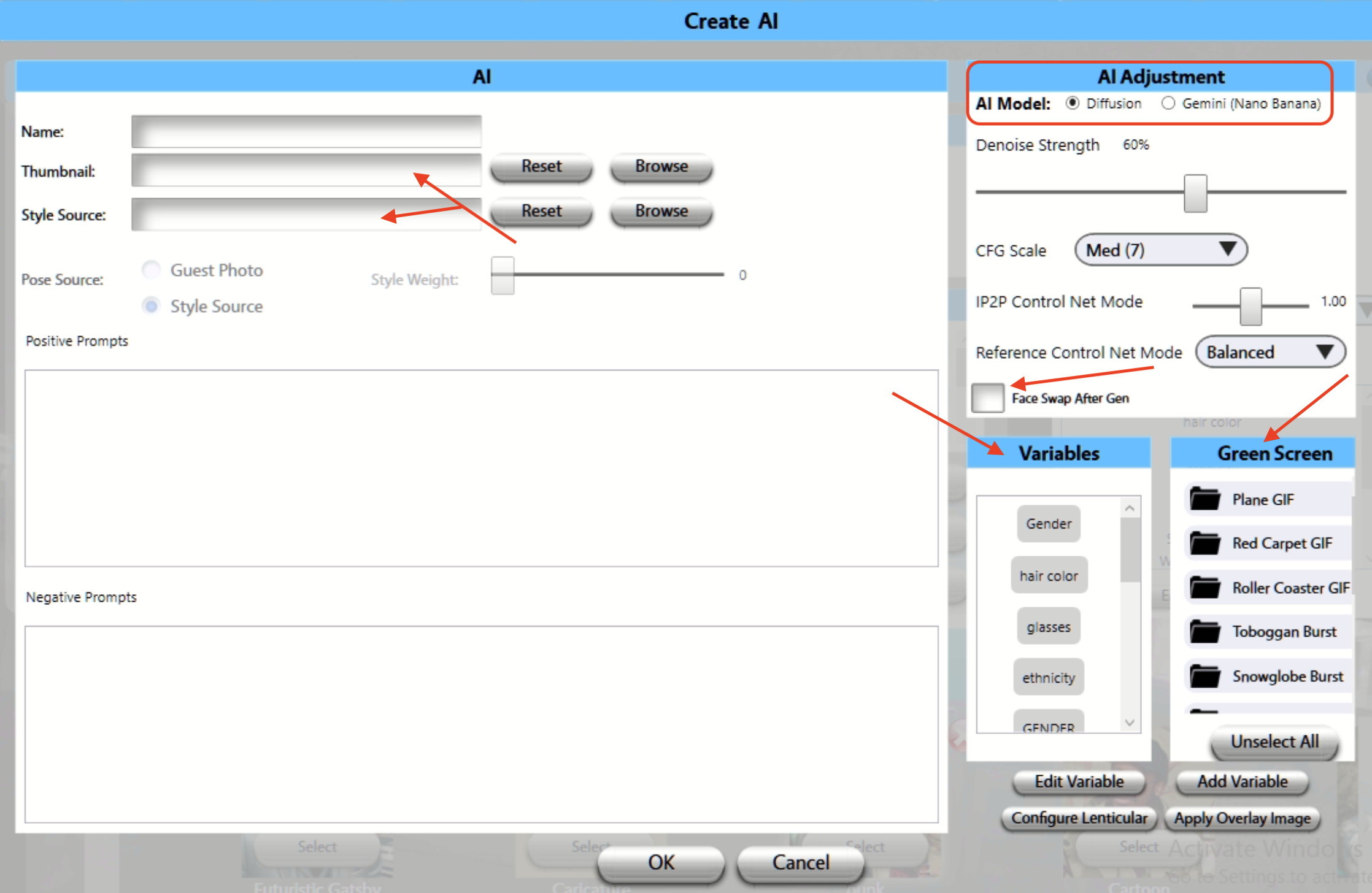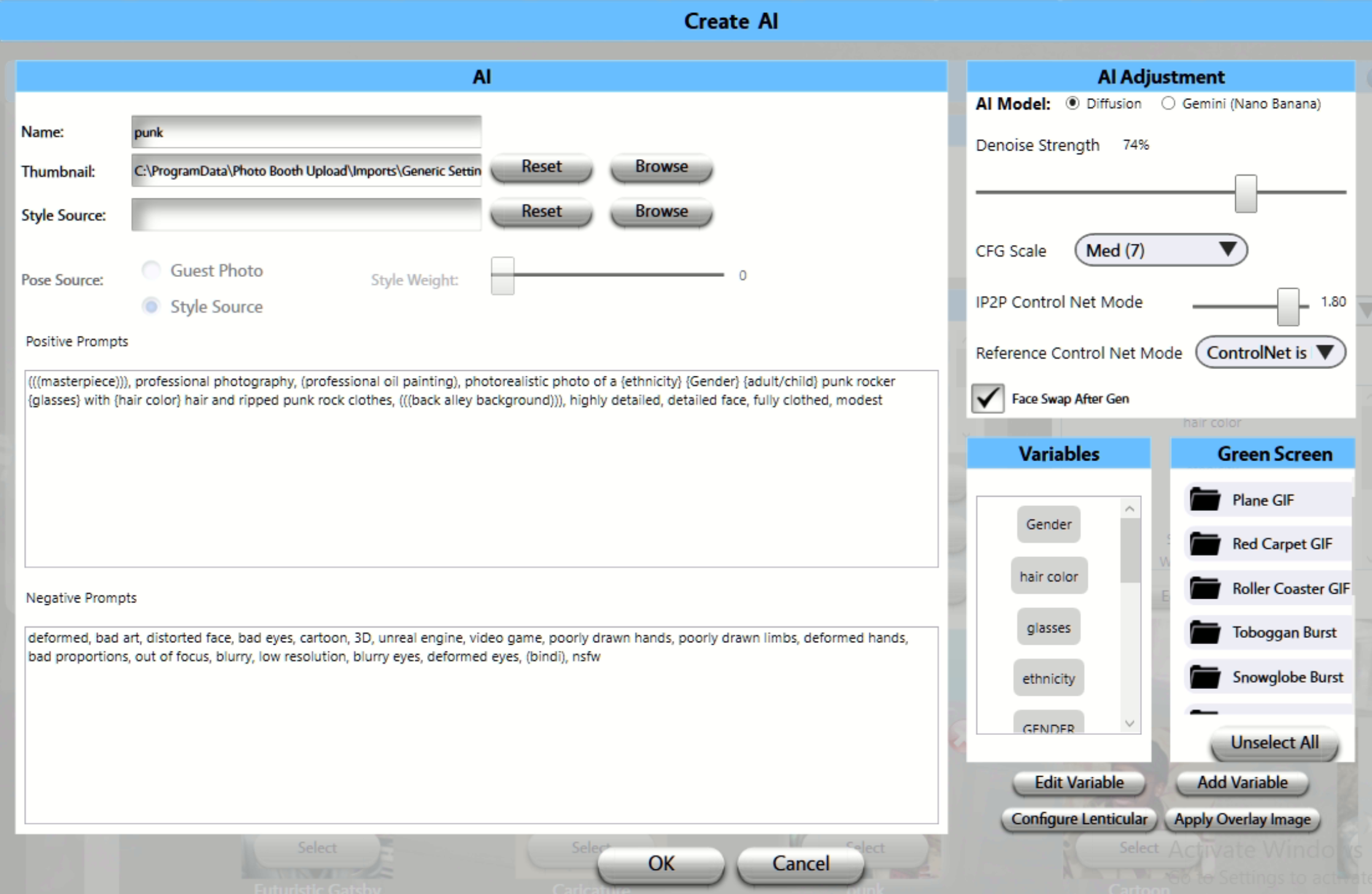 - Green Screen - This will add the selected greenscreen setting to the image BEFORE it is sent to the AI system. These must be 512x512 Resolution (or will be cropped). If you want to add a logo or other overlay after the AI generation, the best place to do that is in your event settings on event manager (which helper will add to the images).
