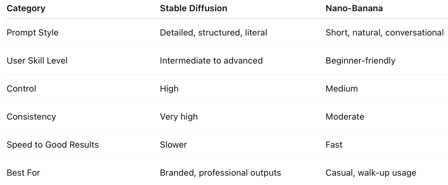 While Stable Diffusion is more literal (and slower), Nana-Banana is more interpretive (and faster).